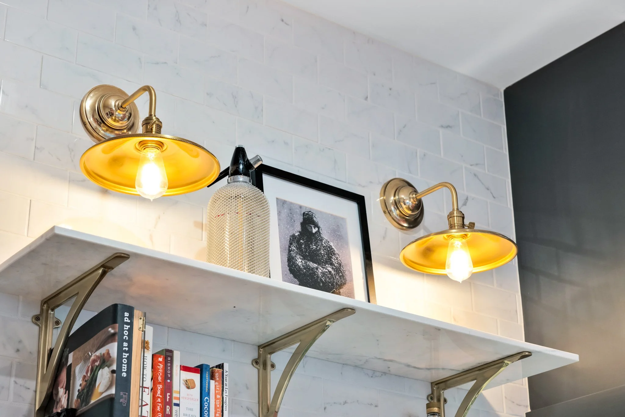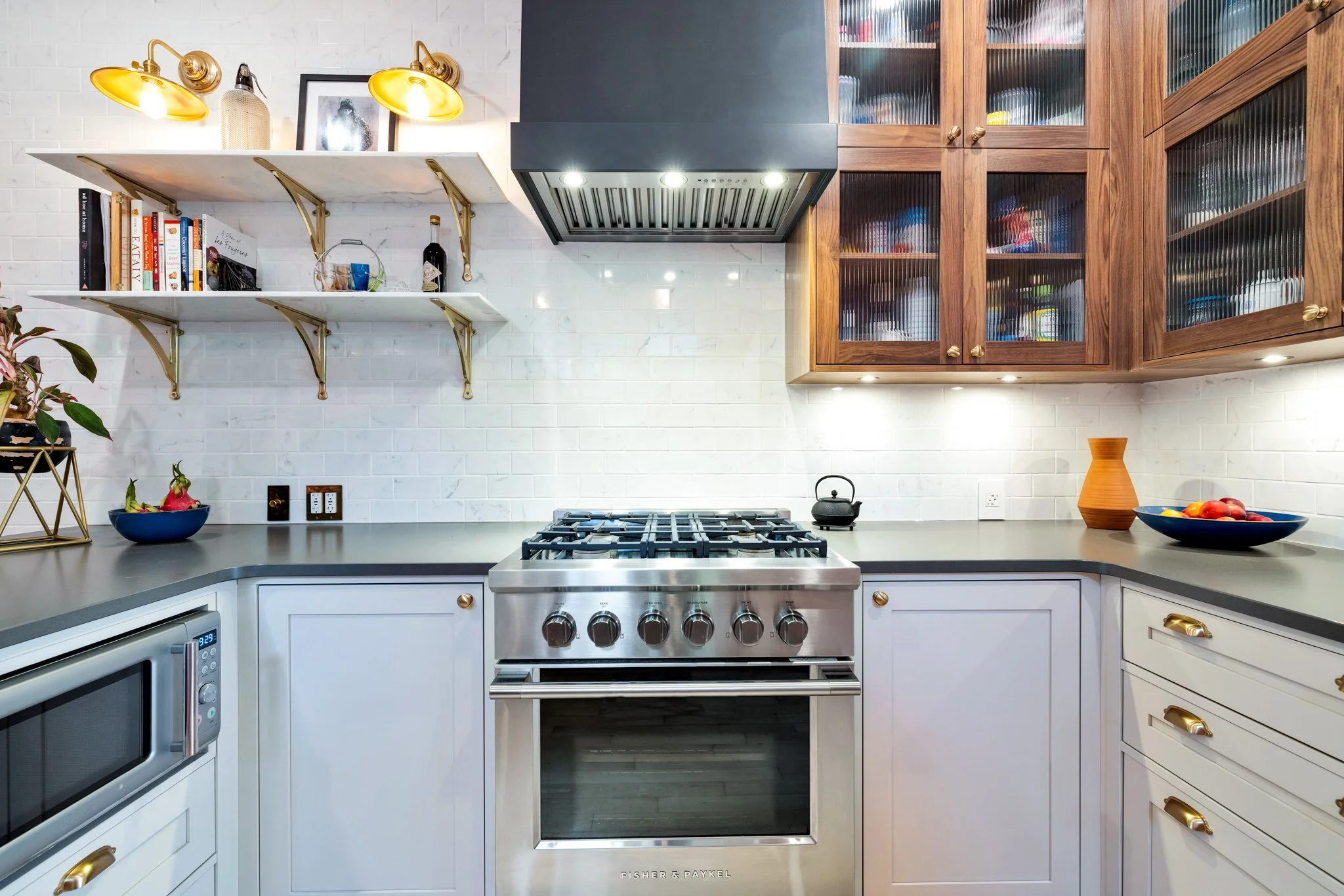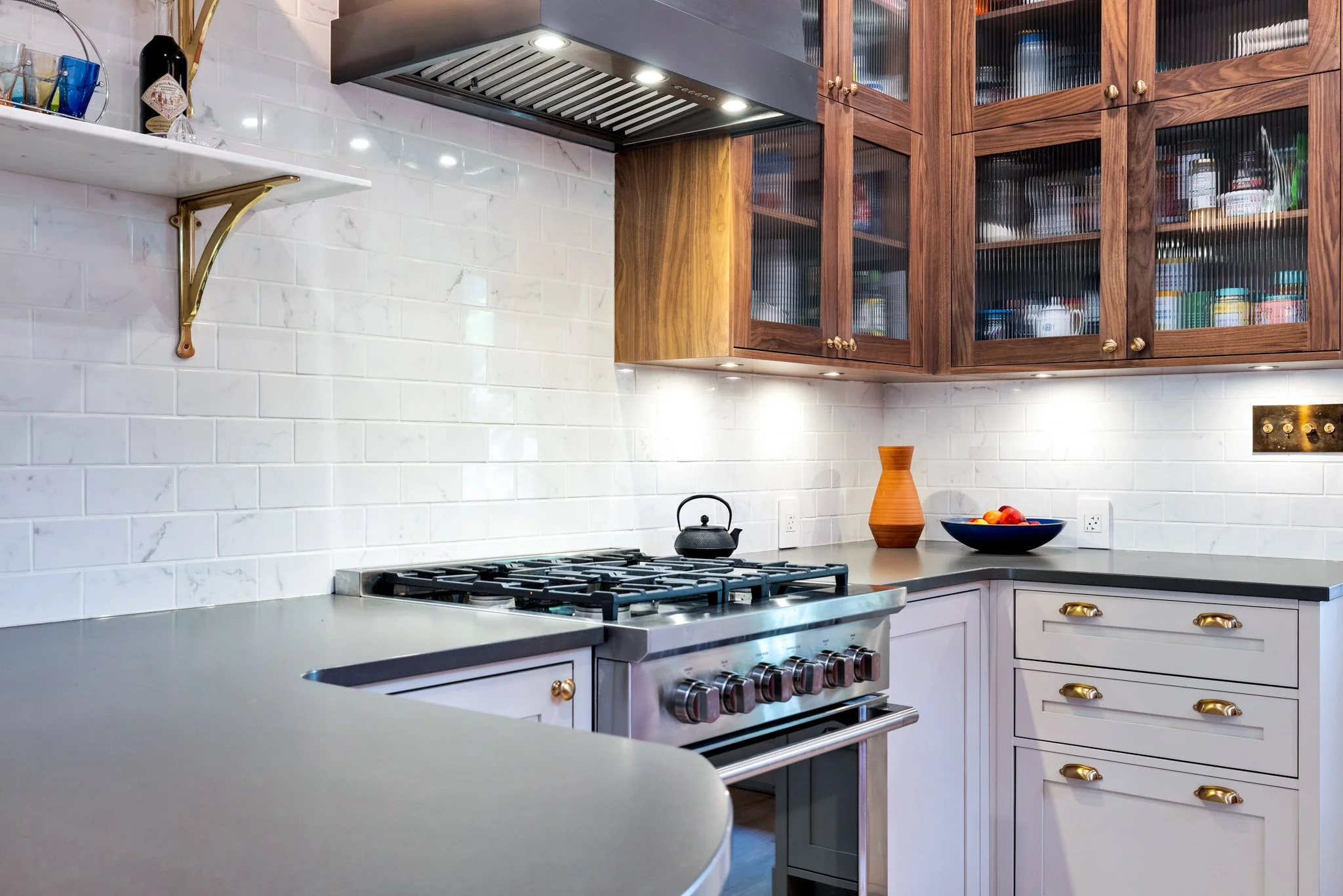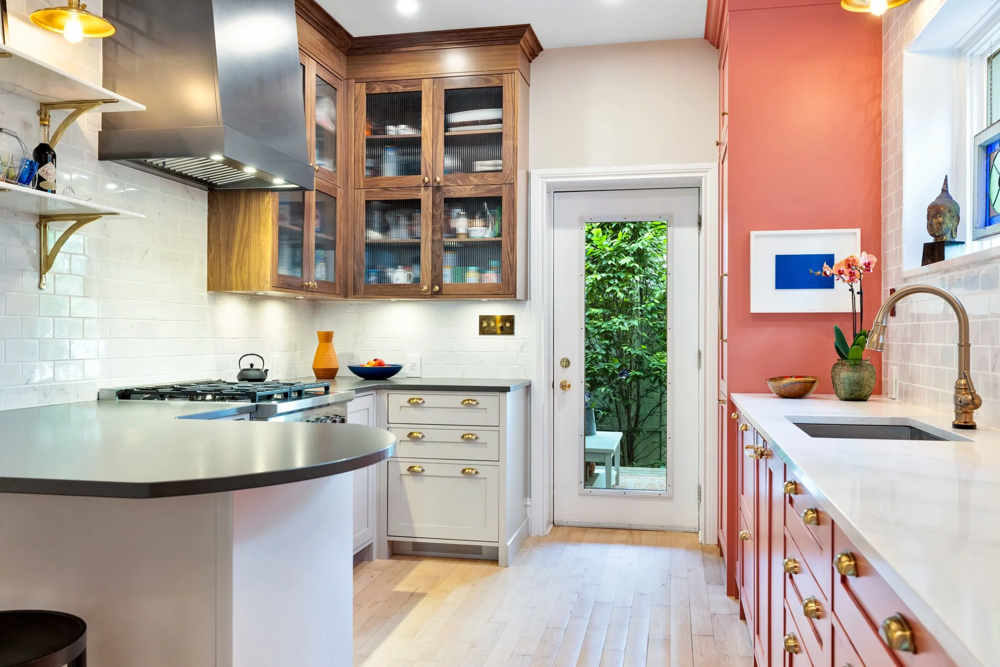A collaboration with designer Vanessa Riddell, this custom-built kitchen is a bold statement in both colour and texture, pairing rich, daring tones with tactile finishes for a space that feels both sophisticated and inviting. A panelled-door refrigerator blends seamlessly with the cabinetry, creating a smooth, uninterrupted visual flow. Unique antique brass electrical coverings add a touch of vintage character, while counter-to-ceiling tile work brings drama, dimension, and a sense of craftsmanship to the room. The result is a kitchen that balances function and artistry, where every detail is thoughtfully designed to elevate both the aesthetic and the experience of cooking and gathering.