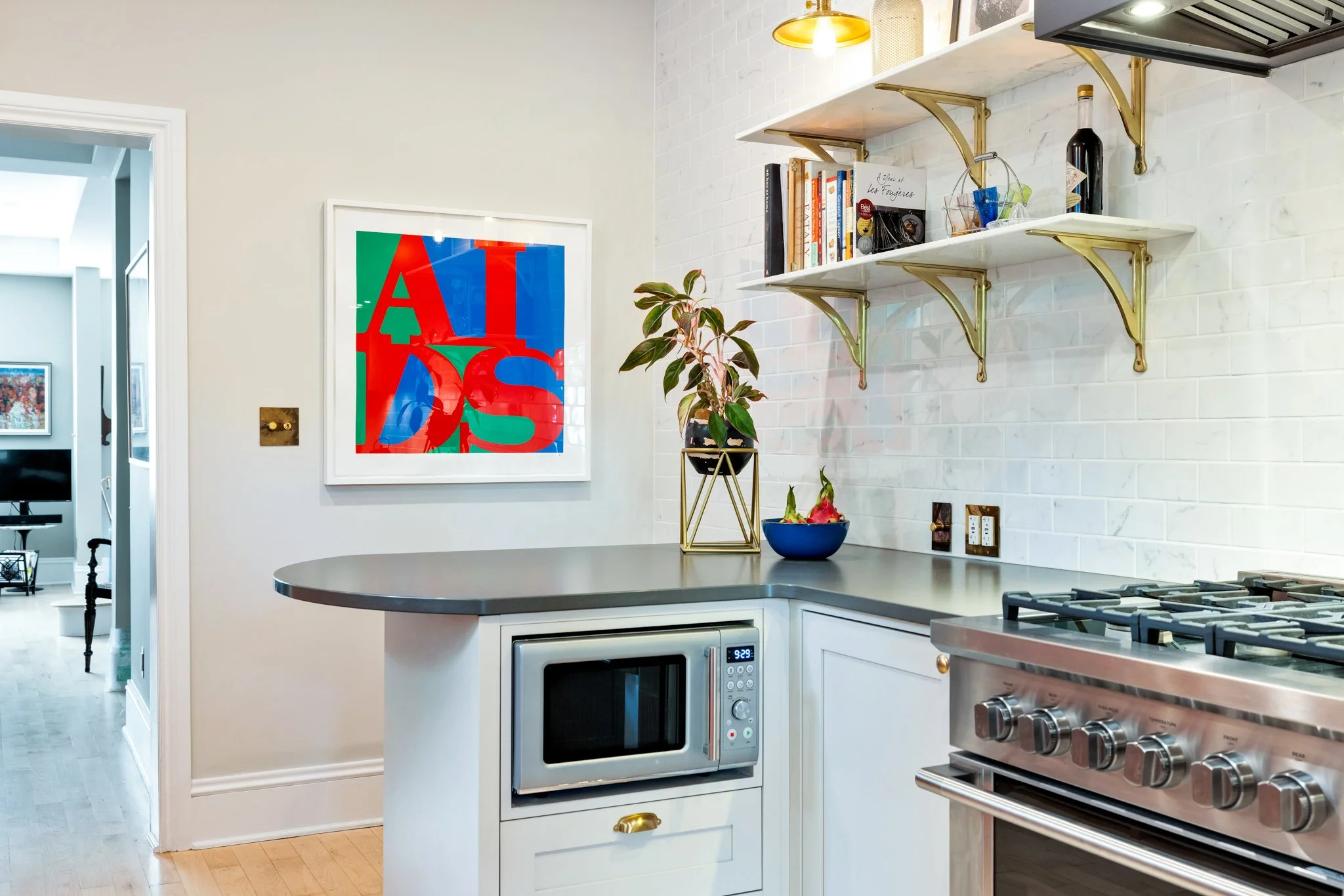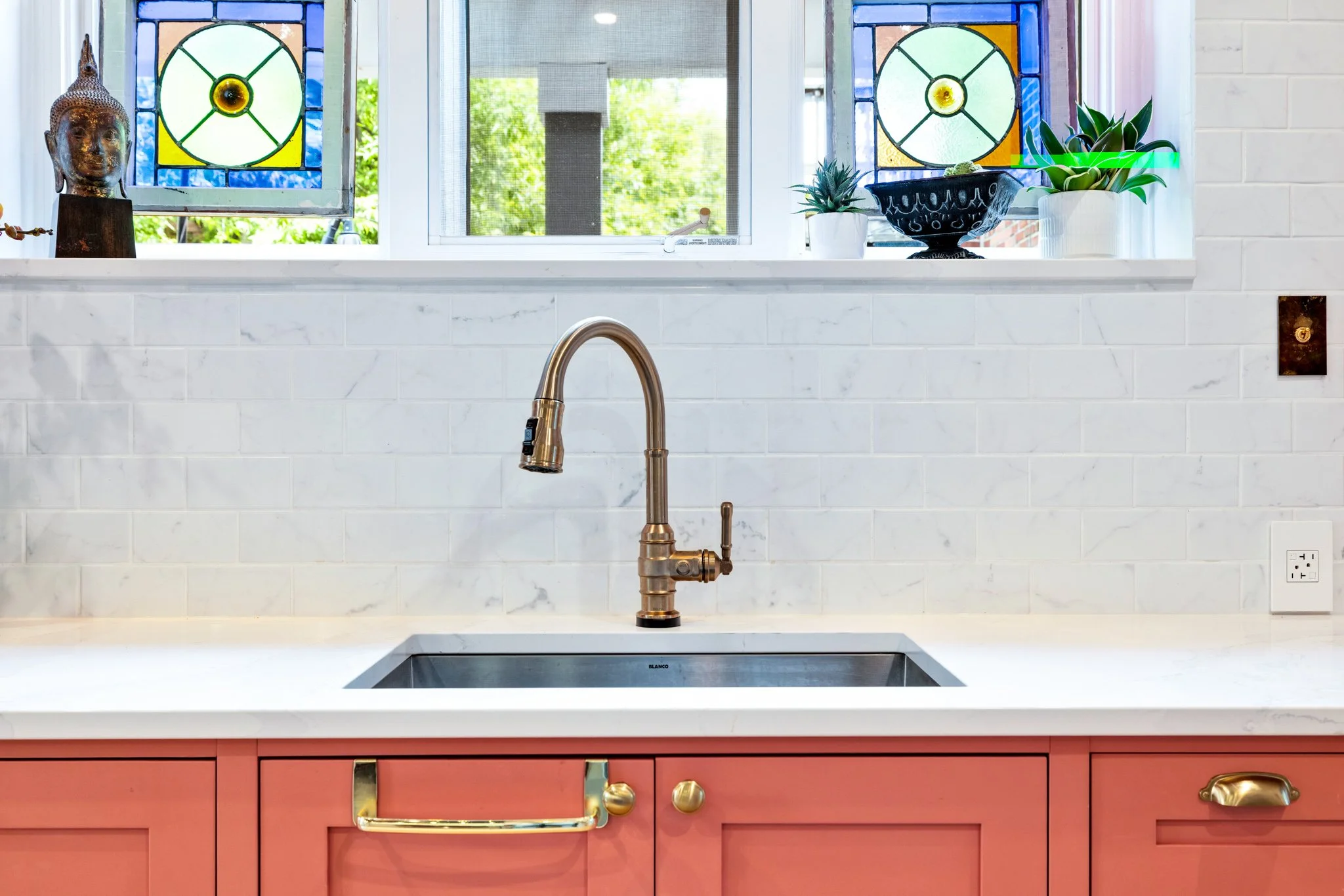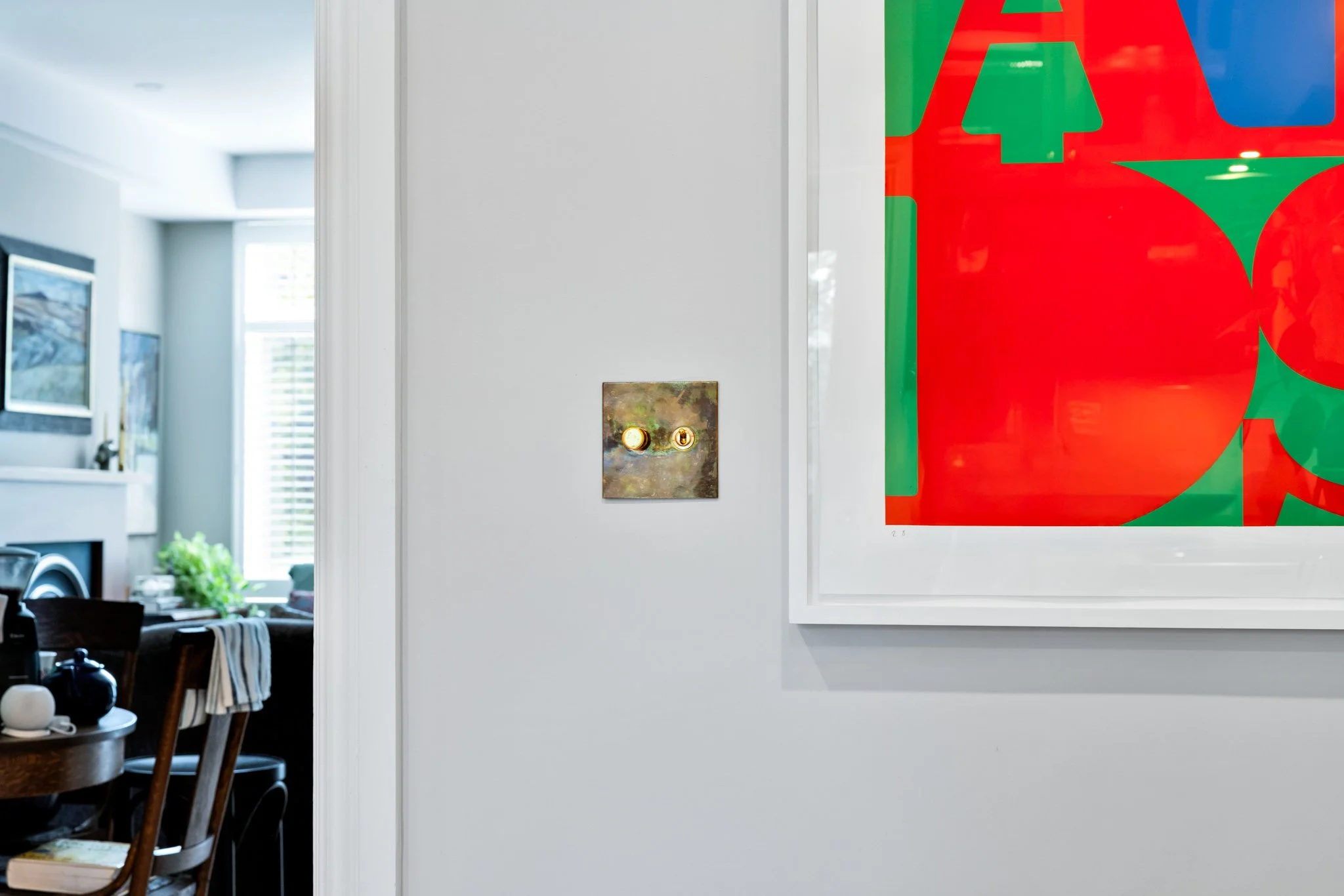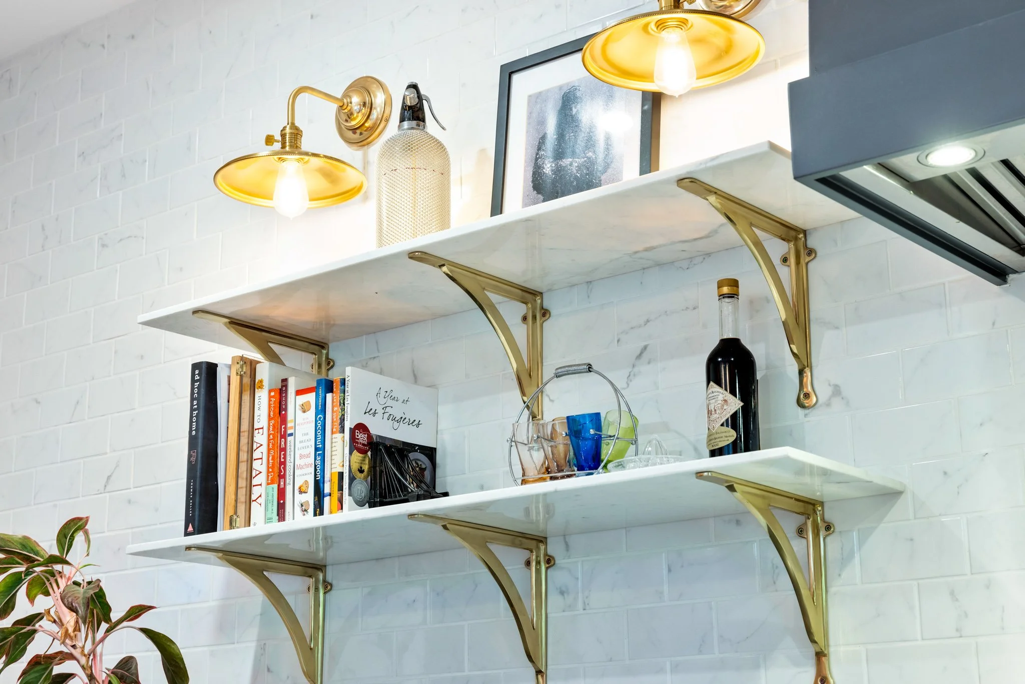 A collaboration with designer Vanessa Riddell, this custom-built kitchen is a bold statement in both colour and texture, pairing rich, daring tones with tactile finishes for a space that feels both sophisticated and inviting. A panelled-door refrigerator blends seamlessly with the cabinetry, creating a smooth, uninterrupted visual flow. Unique antique brass electrical coverings add a touch of vintage character, while counter-to-ceiling tile work brings drama, dimension, and a sense of craftsmanship to the room. The result is a kitchen that balances function and artistry, where every detail is thoughtfully designed to elevate both the aesthetic and the experience of cooking and gathering.