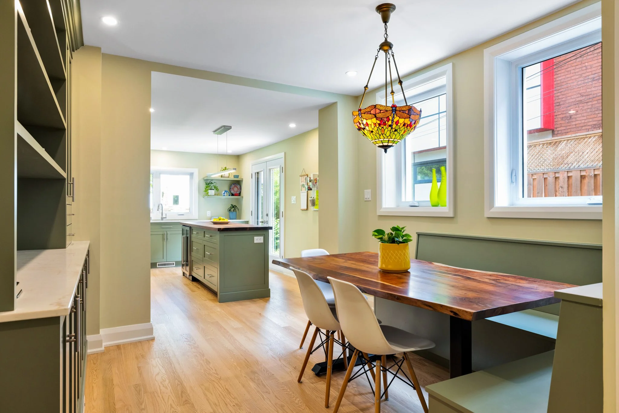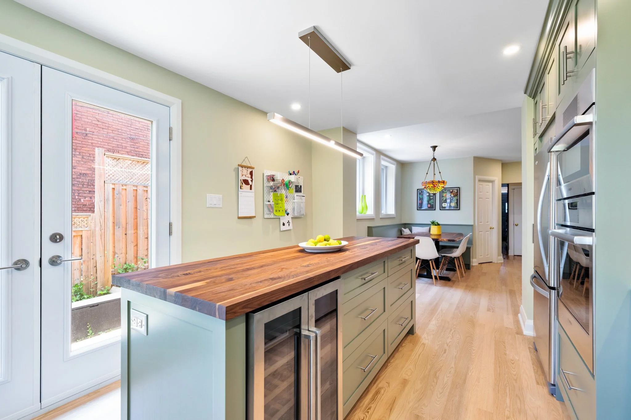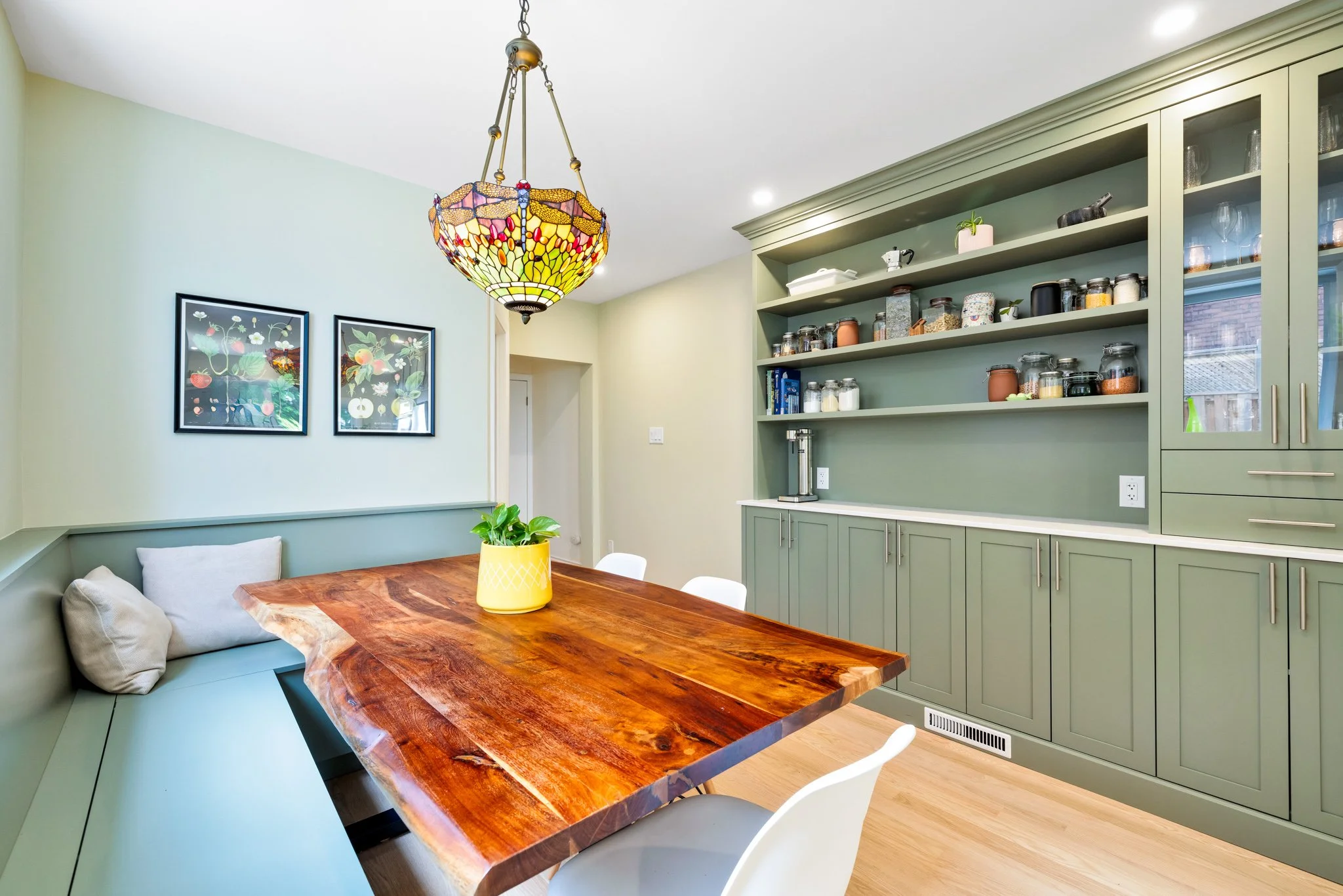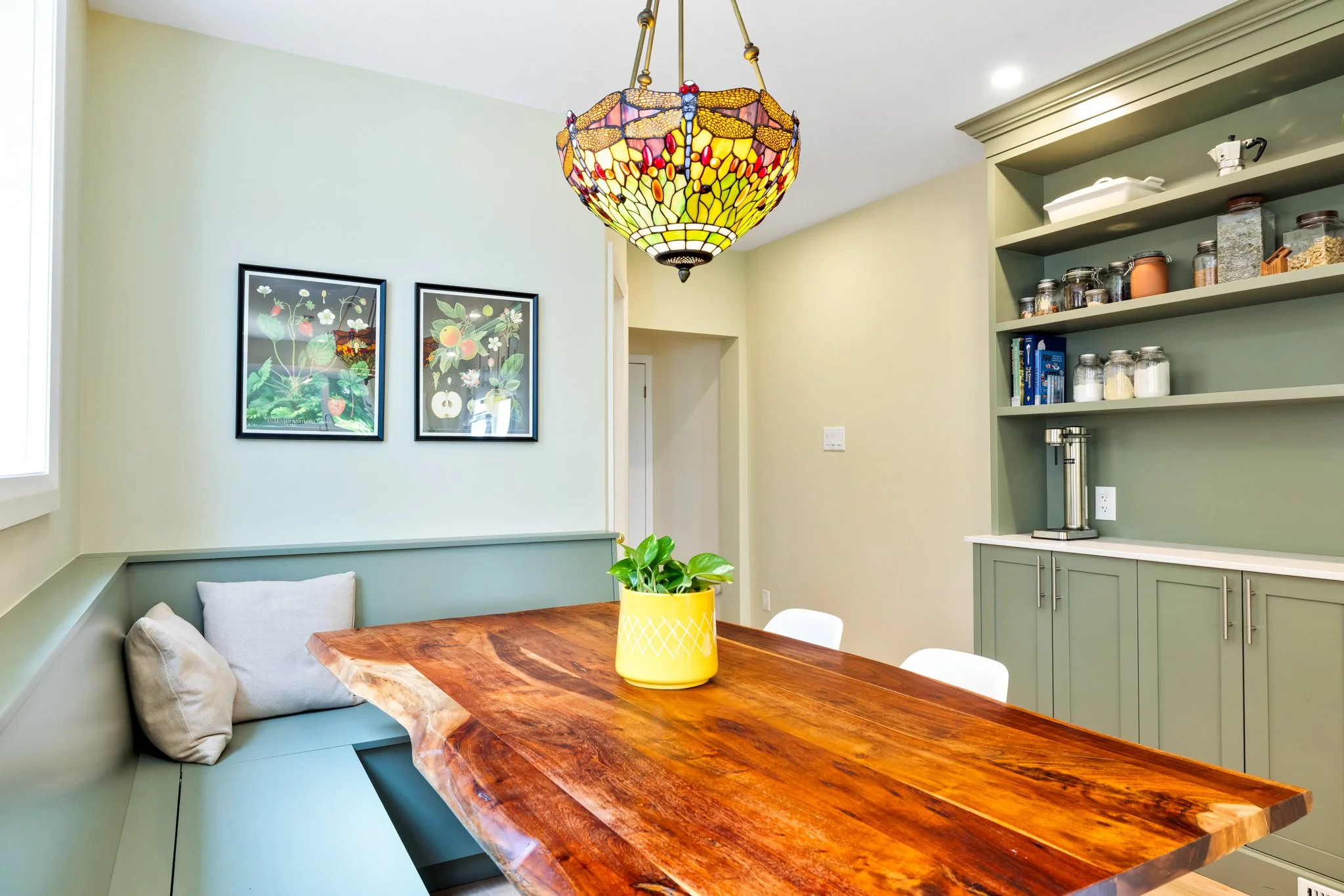 This custom-built kitchen embraces warm, calming earth tones throughout the cabinetry and walls, creating a serene and welcoming atmosphere. At its heart is a generous island crowned with a locally crafted walnut butcher block counter—a true centrepiece that blends beauty with function. Natural light pours in through a new window and exterior door, brightening the space and enhancing the rich, organic palette. The counters transition seamlessly into a stunning stone backsplash, delivering a modern, streamlined finish. An inviting banquette offers the perfect spot to share meals, while clever bench storage and an opposing storage cabinet with hutch provide ample room for every kitchen essential. The result is a harmonious blend of comfort, craftsmanship, and everyday practicality.