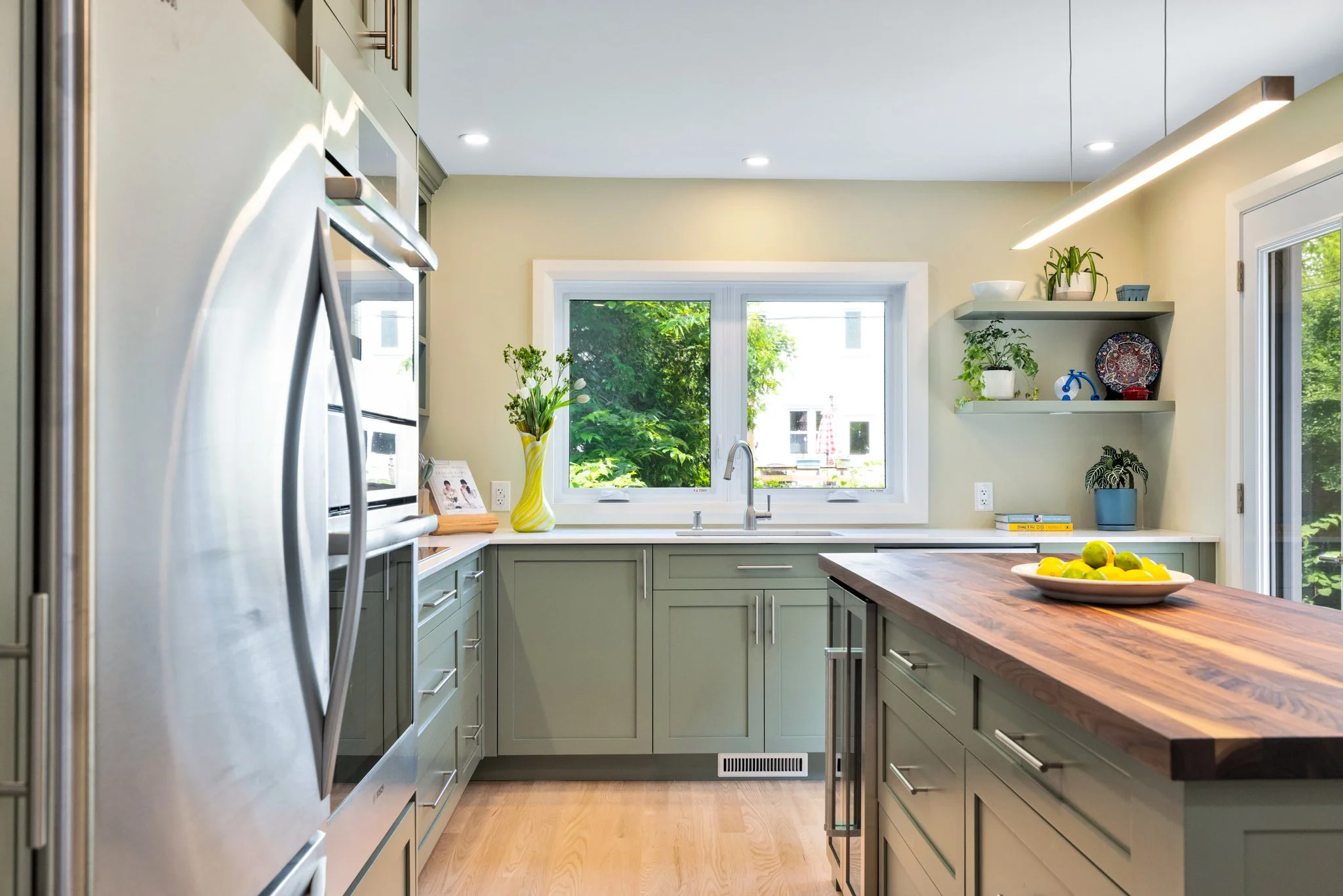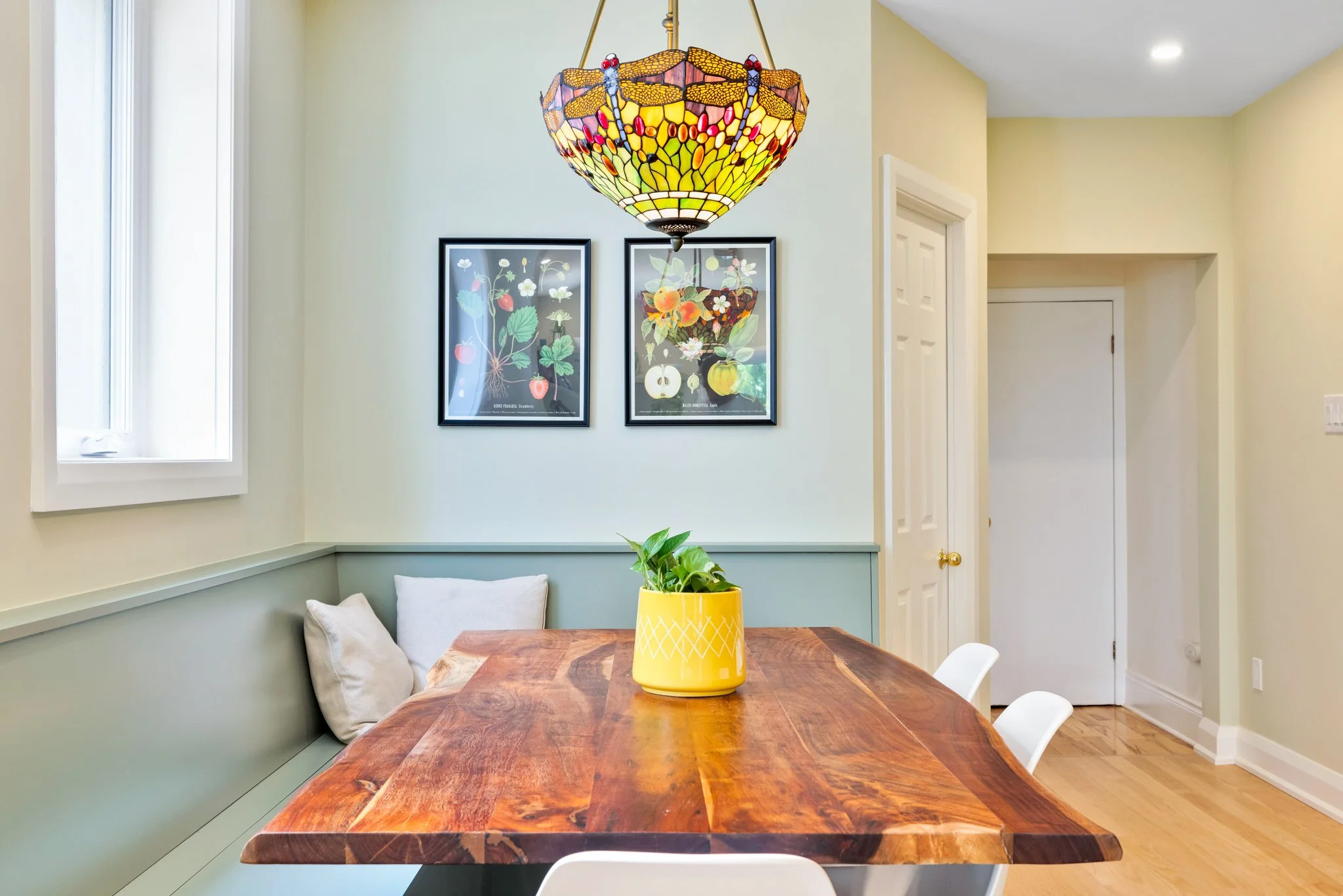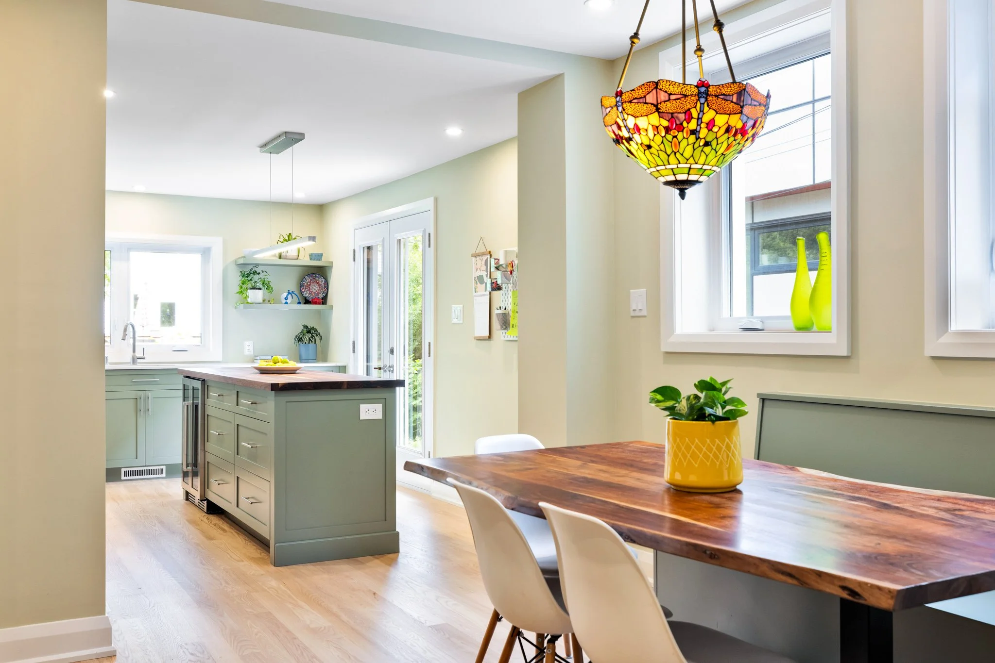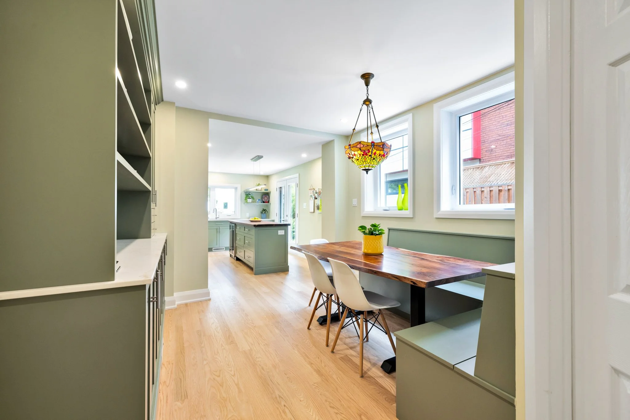 This custom-built kitchen embraces warm, calming earth tones throughout the cabinetry and walls, creating a serene and welcoming atmosphere. At its heart is a generous island crowned with a locally crafted walnut butcher block counter—a true centrepiece that blends beauty with function. Natural light pours in through a new window and exterior door, brightening the space and enhancing the rich, organic palette. The counters transition seamlessly into a stunning stone backsplash, delivering a modern, streamlined finish. An inviting banquette offers the perfect spot to share meals, while clever bench storage and an opposing storage cabinet with hutch provide ample room for every kitchen essential. The result is a harmonious blend of comfort, craftsmanship, and everyday practicality.
