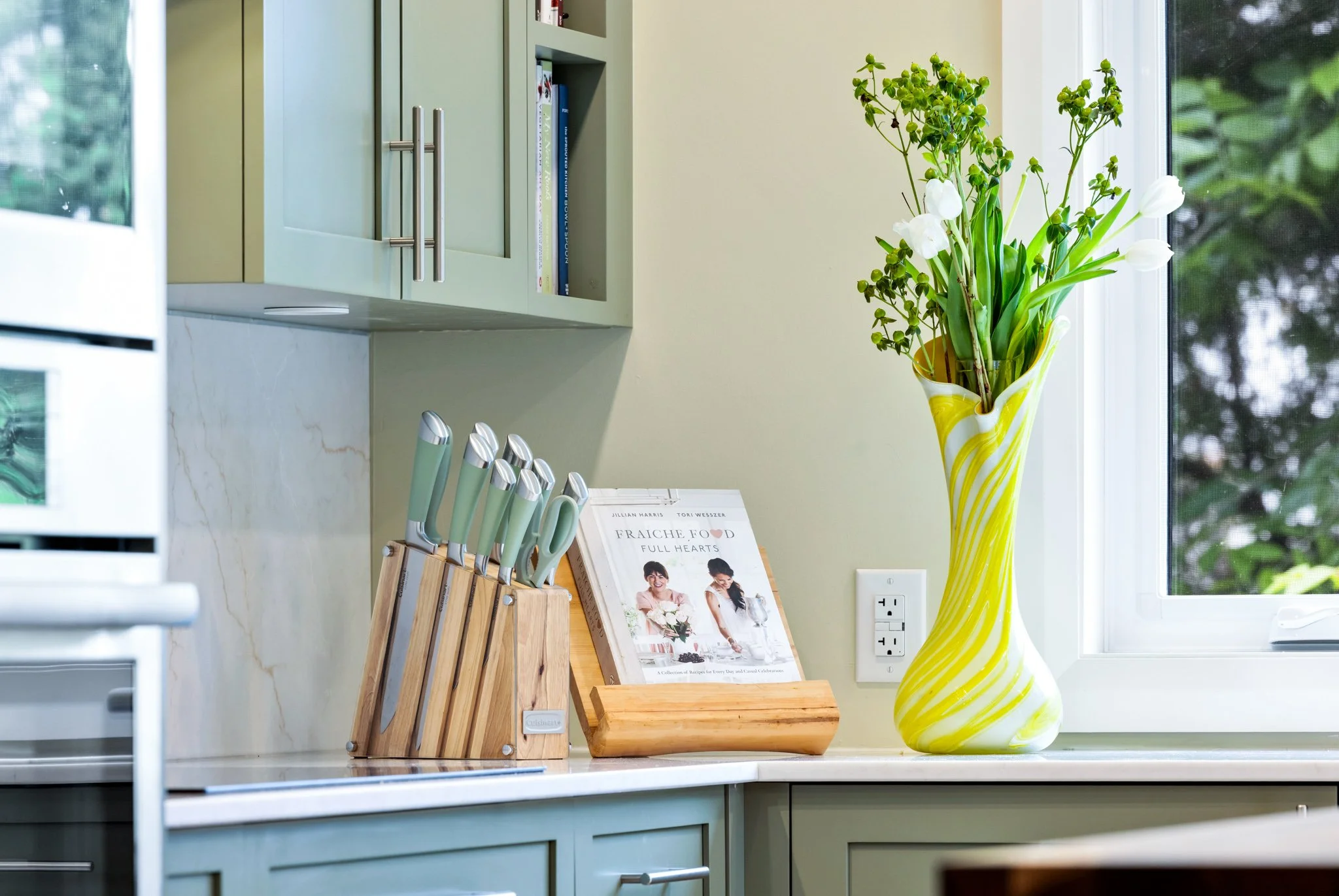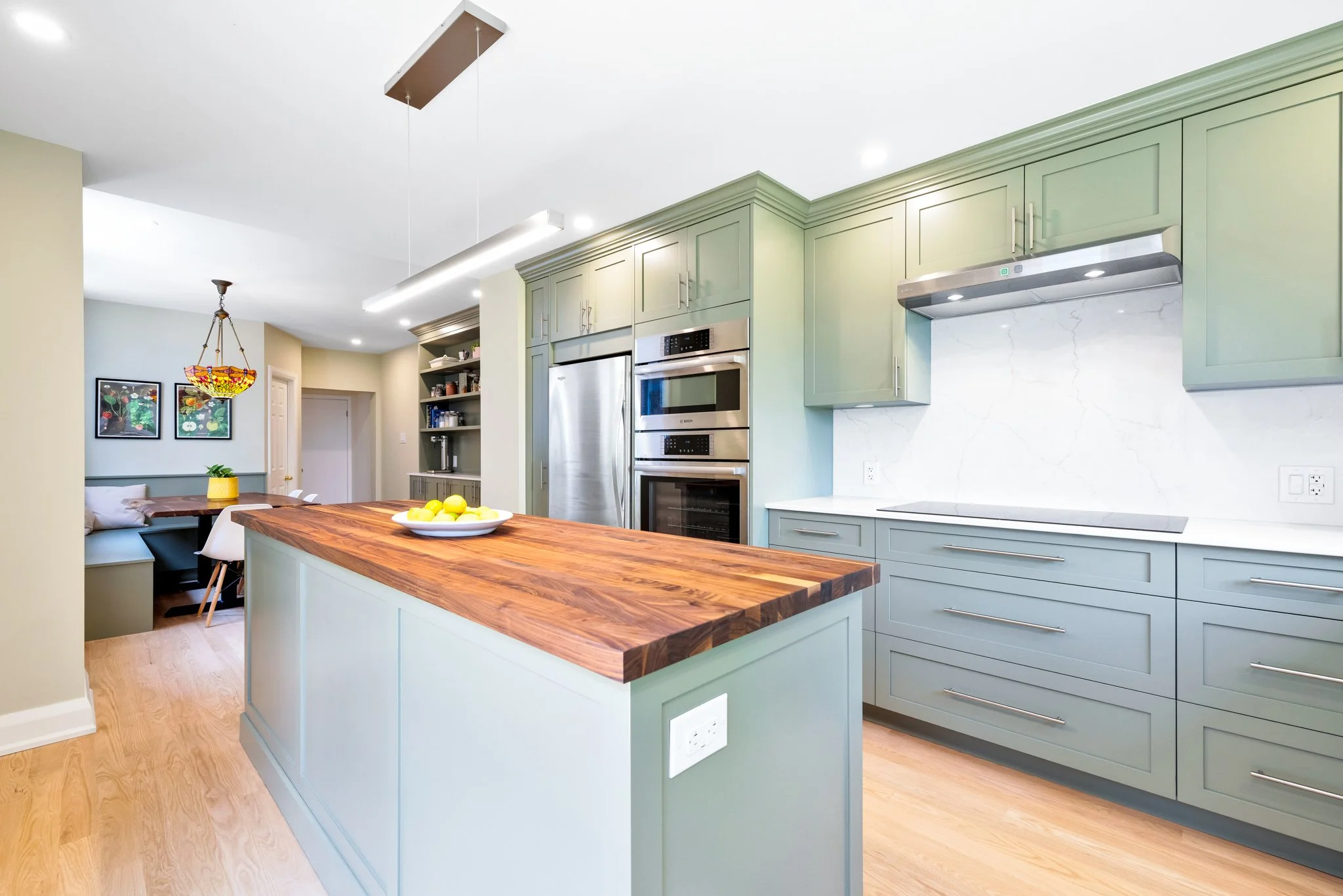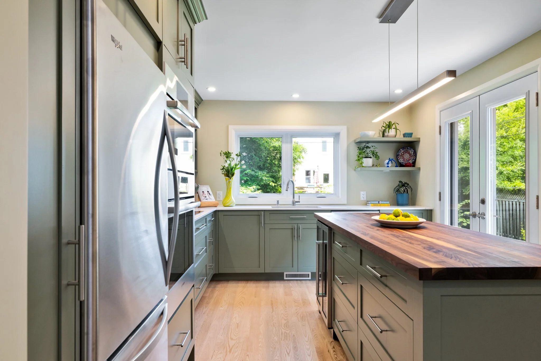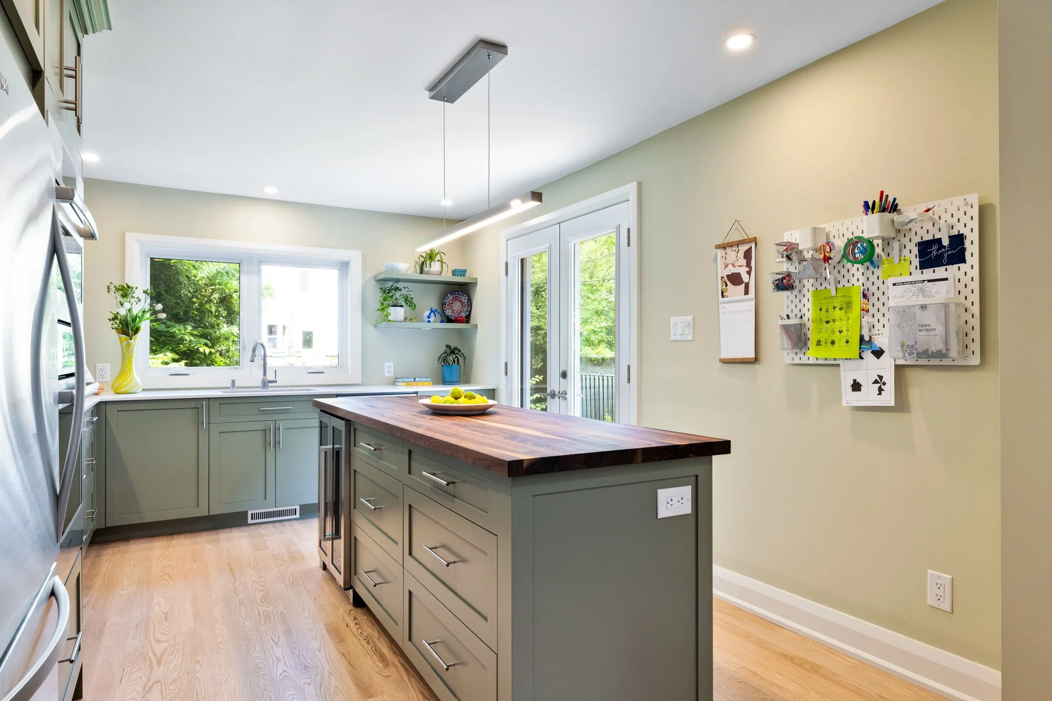 This custom-built kitchen embraces warm, calming earth tones throughout the cabinetry and walls, creating a serene and welcoming atmosphere. At its heart is a generous island crowned with a locally crafted walnut butcher block counter—a true centrepiece that blends beauty with function. Natural light pours in through a new window and exterior door, brightening the space and enhancing the rich, organic palette. The counters transition seamlessly into a stunning stone backsplash, delivering a modern, streamlined finish. An inviting banquette offers the perfect spot to share meals, while clever bench storage and an opposing storage cabinet with hutch provide ample room for every kitchen essential. The result is a harmonious blend of comfort, craftsmanship, and everyday practicality.