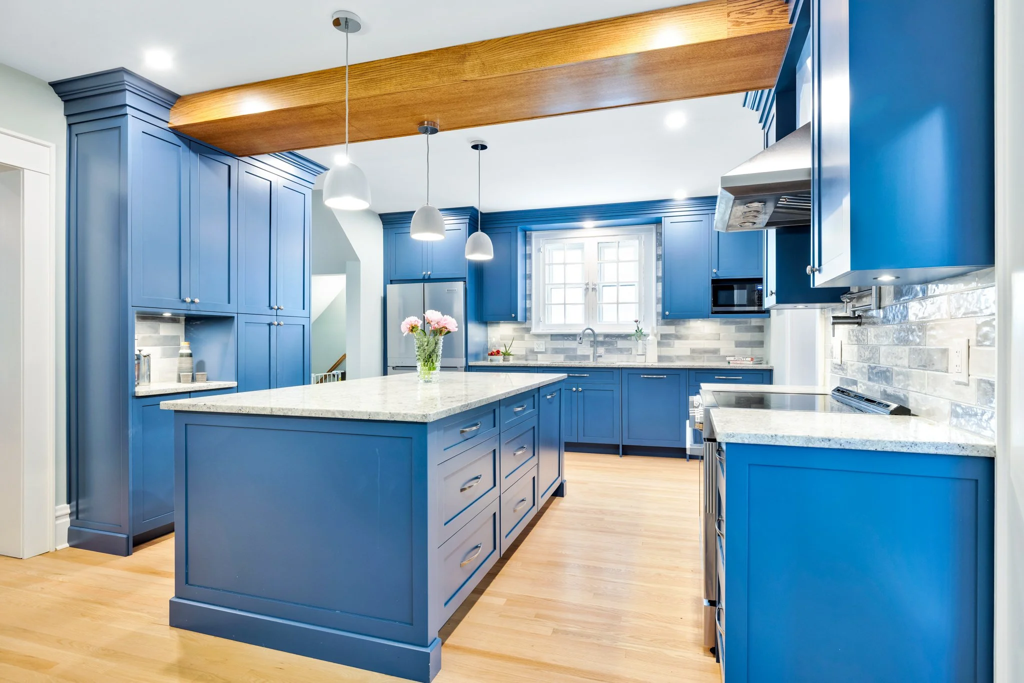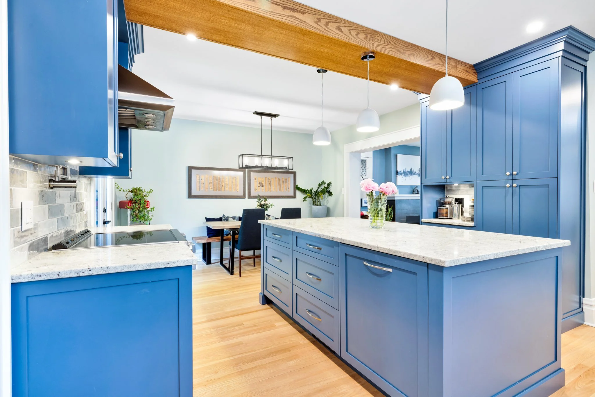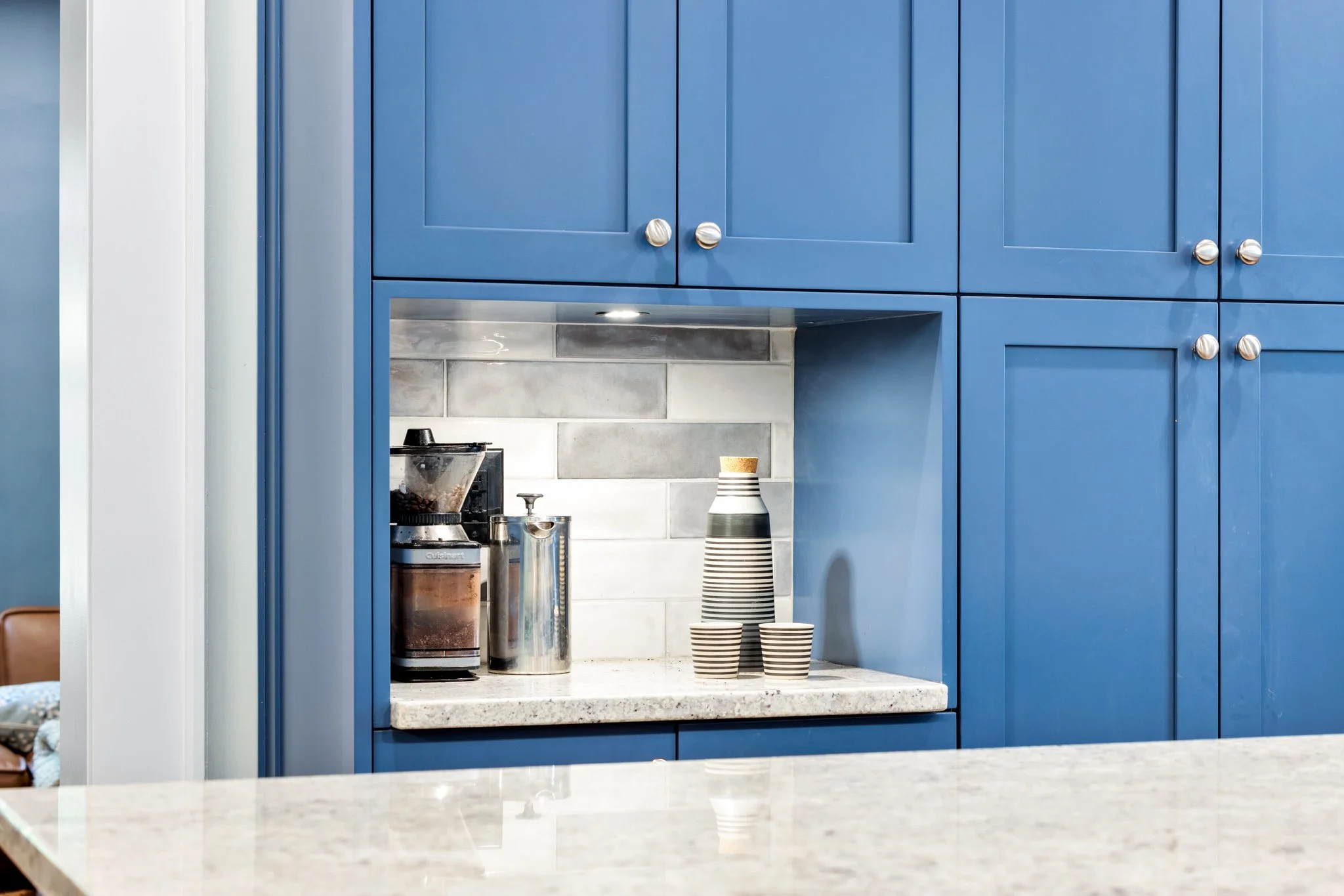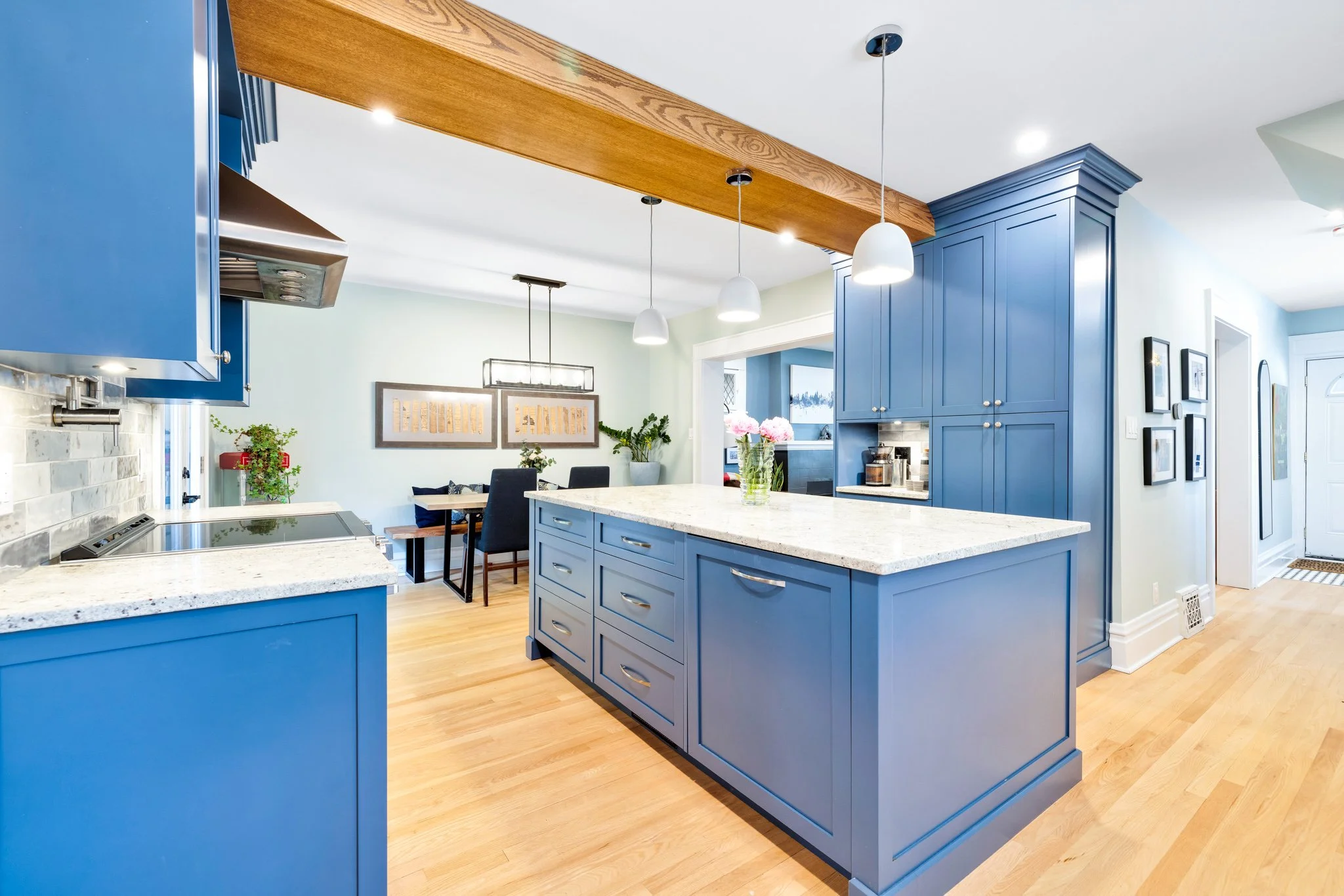 This custom-built kitchen makes a striking statement with bold dark blue cabinetry, balanced by crisp white stone countertops for a timeless contrast. The expansive island, both wide and deep, offers generous storage and comfortable seating, making it the true hub of the space. Cleverly integrated into the pantry cabinets is a handy coffee bar, keeping morning rituals organized and accessible. A pot filler above the stove adds modern convenience, while a beautifully finished hardwood beam cleverly conceals structural elements, bringing warmth and architectural interest. Ample square footage allows for a spacious dining area, and a large exterior door floods the room with natural light, creating an inviting and functional environment perfect for both cooking and gathering.