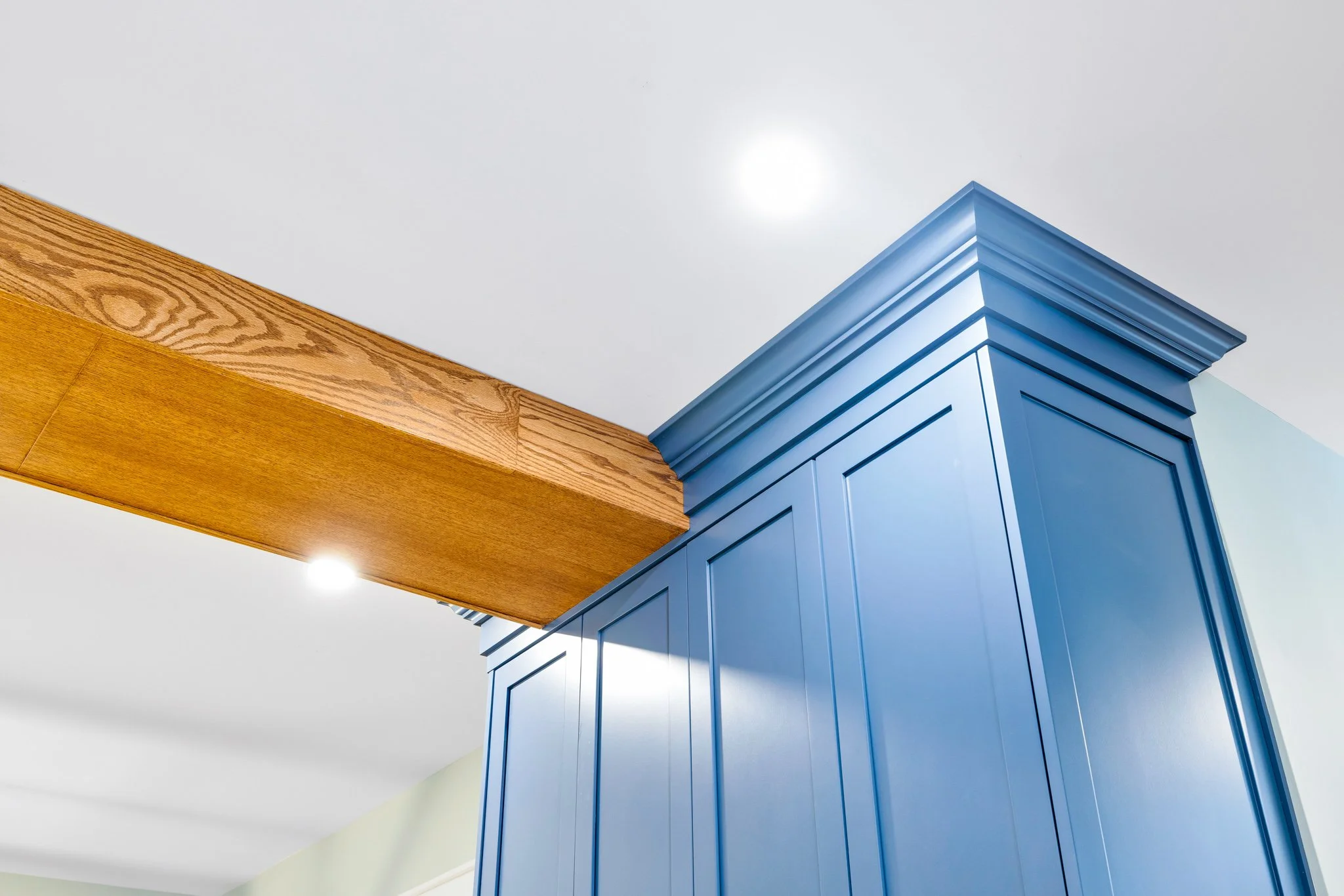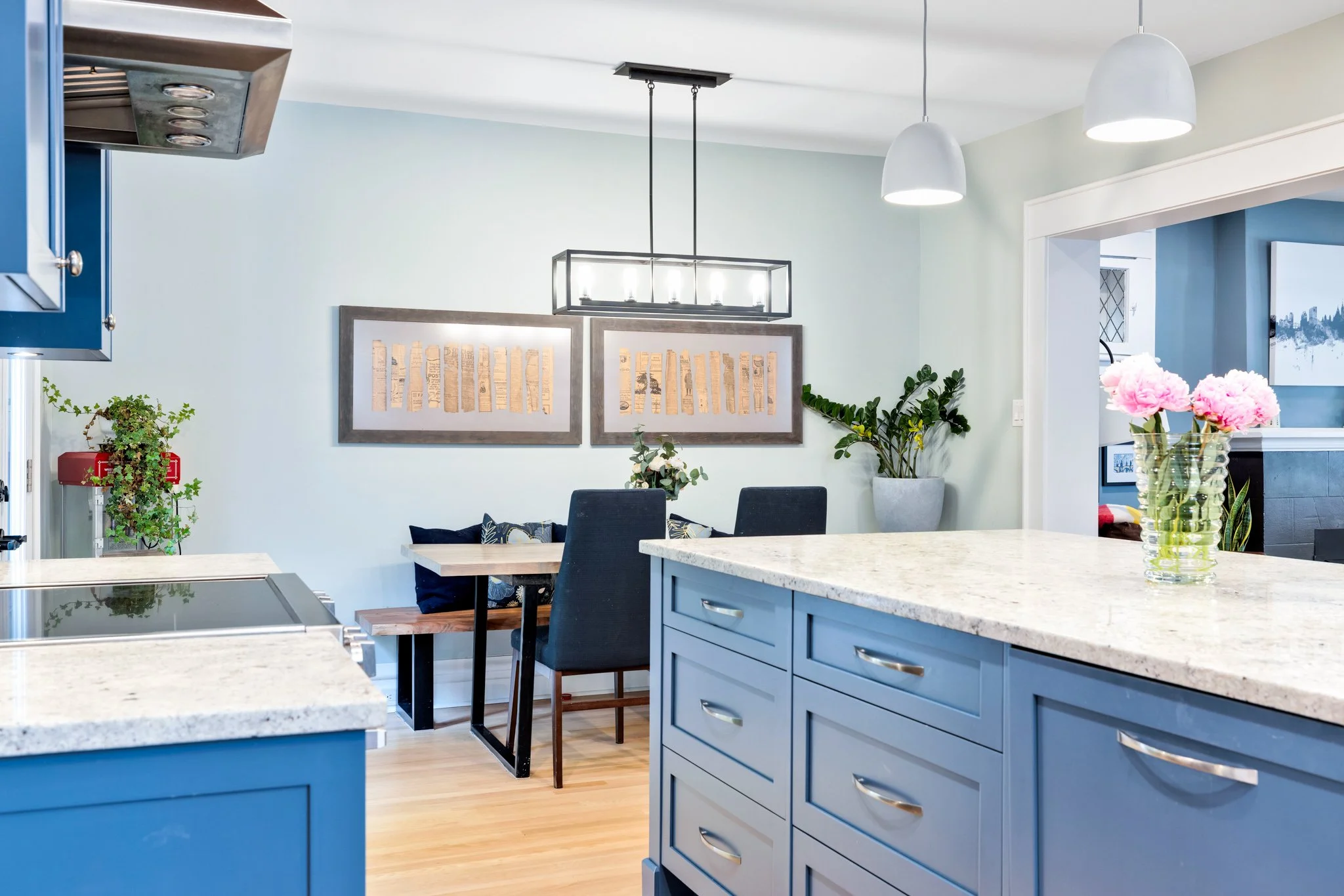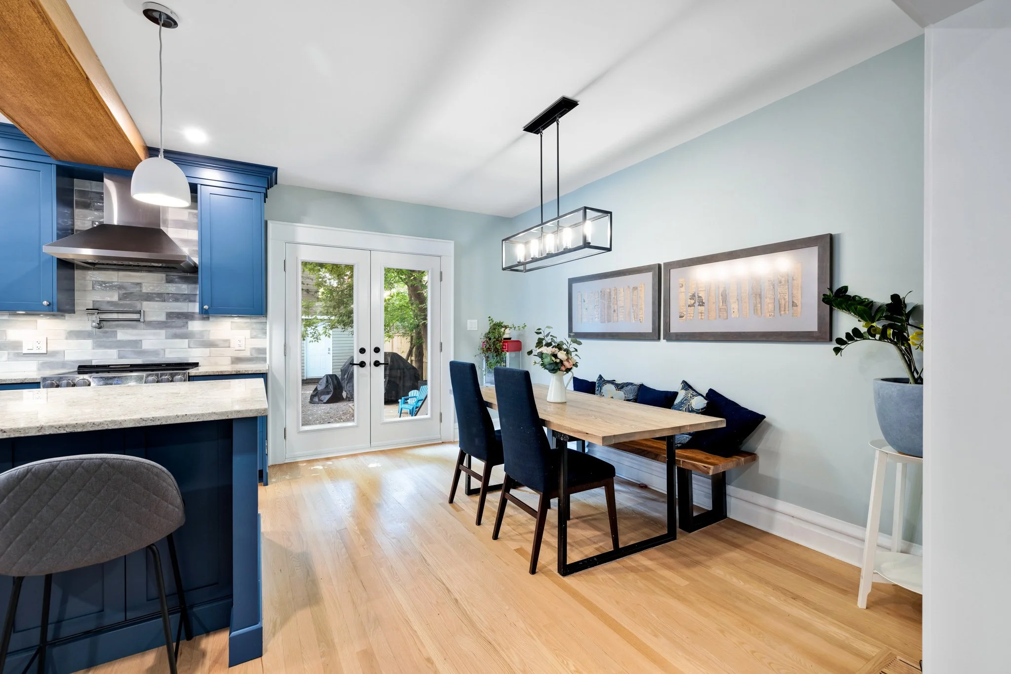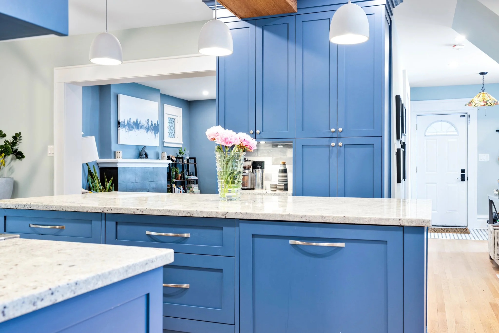 This custom-built kitchen makes a striking statement with bold dark blue cabinetry, balanced by crisp white stone countertops for a timeless contrast. The expansive island, both wide and deep, offers generous storage and comfortable seating, making it the true hub of the space. Cleverly integrated into the pantry cabinets is a handy coffee bar, keeping morning rituals organized and accessible. A pot filler above the stove adds modern convenience, while a beautifully finished hardwood beam cleverly conceals structural elements, bringing warmth and architectural interest. Ample square footage allows for a spacious dining area, and a large exterior door floods the room with natural light, creating an inviting and functional environment perfect for both cooking and gathering.