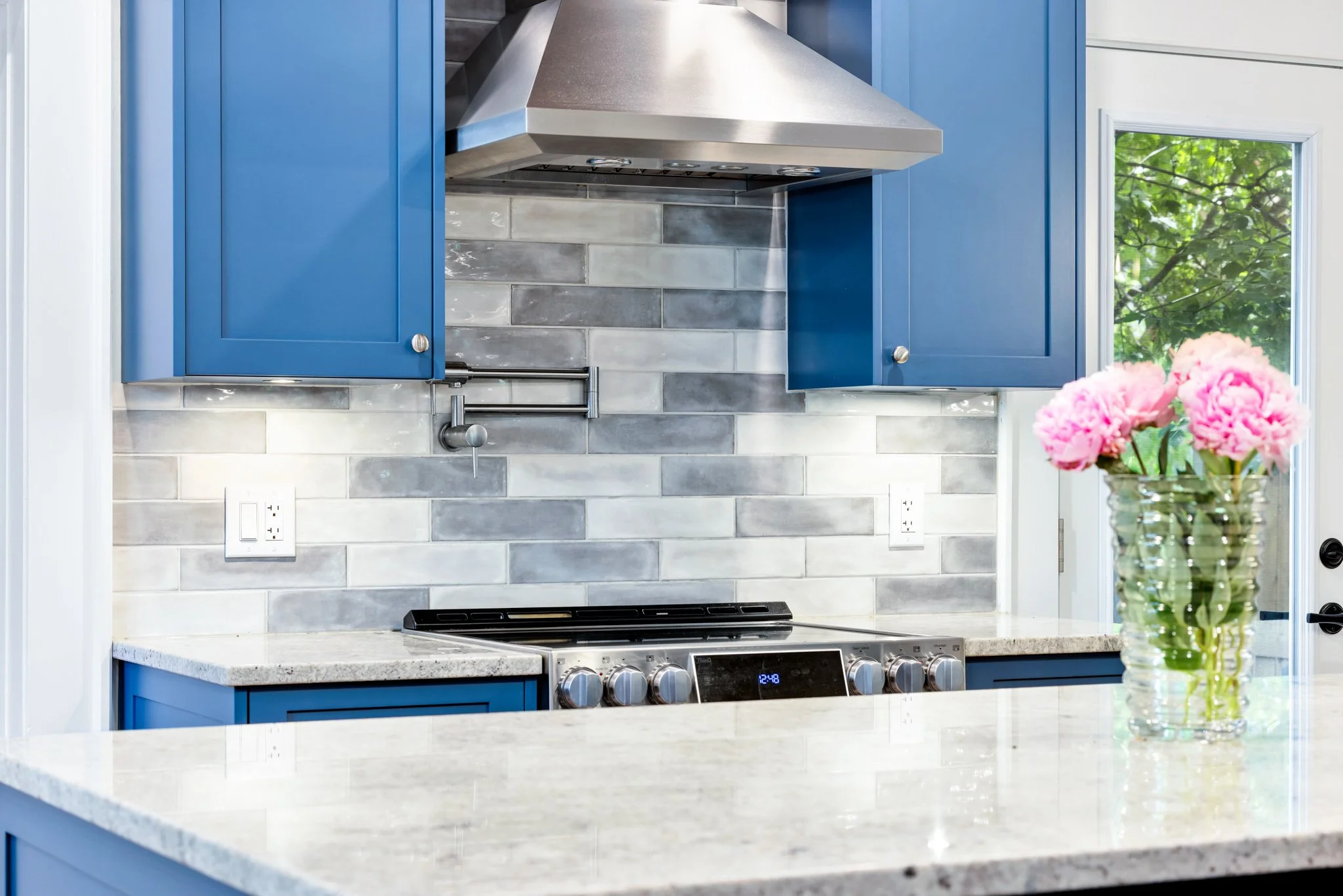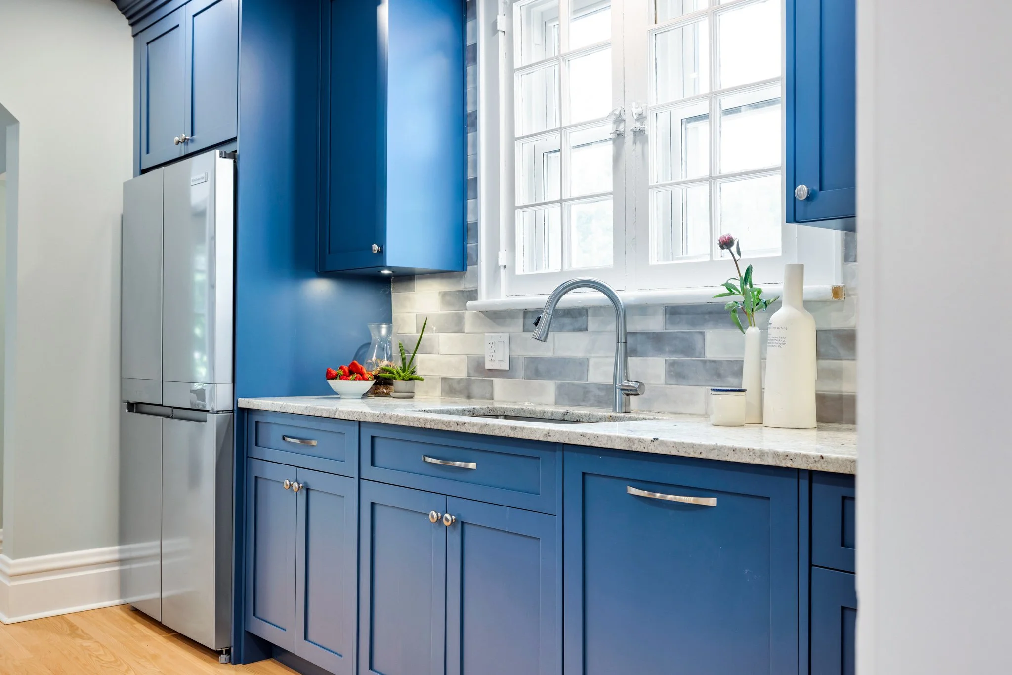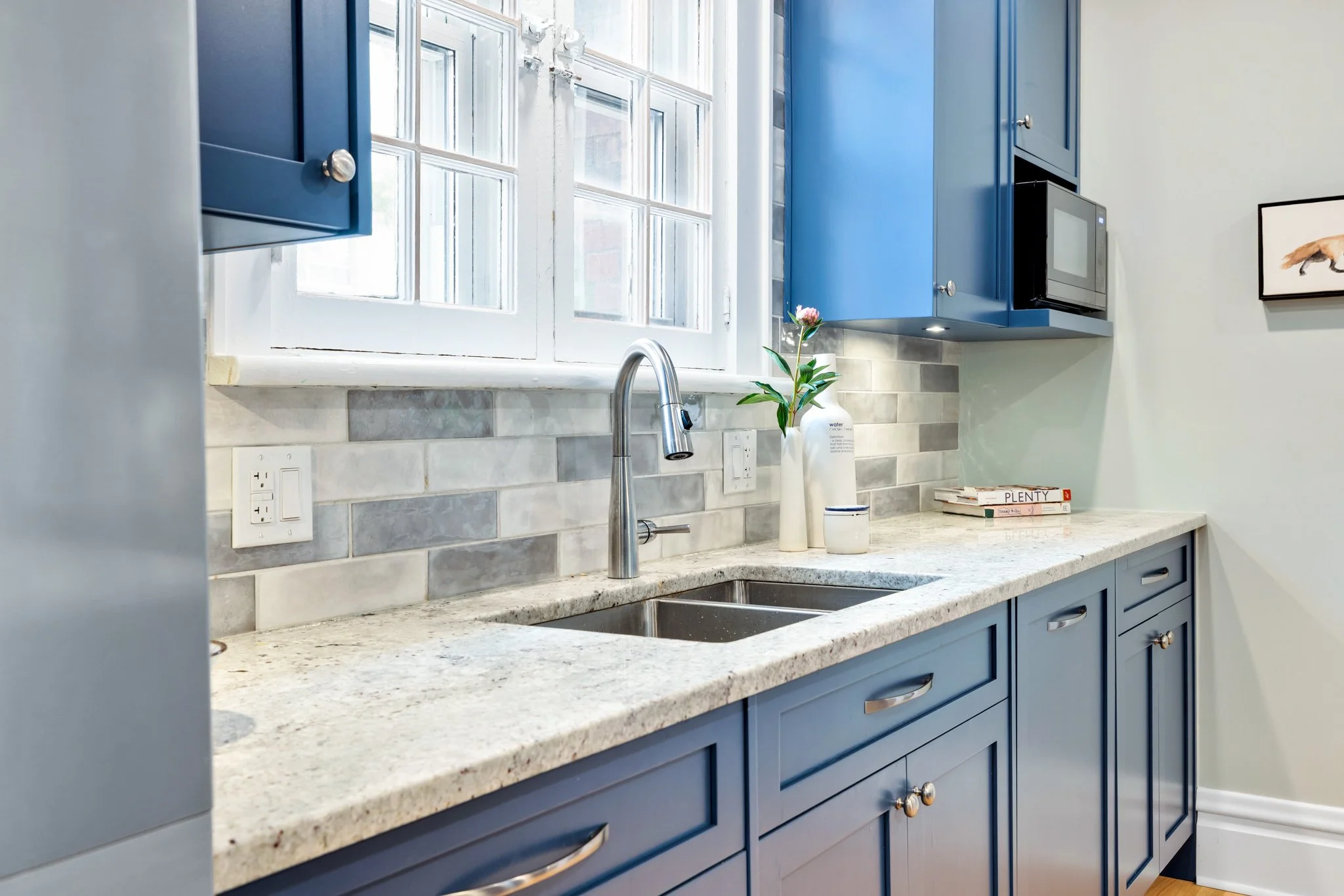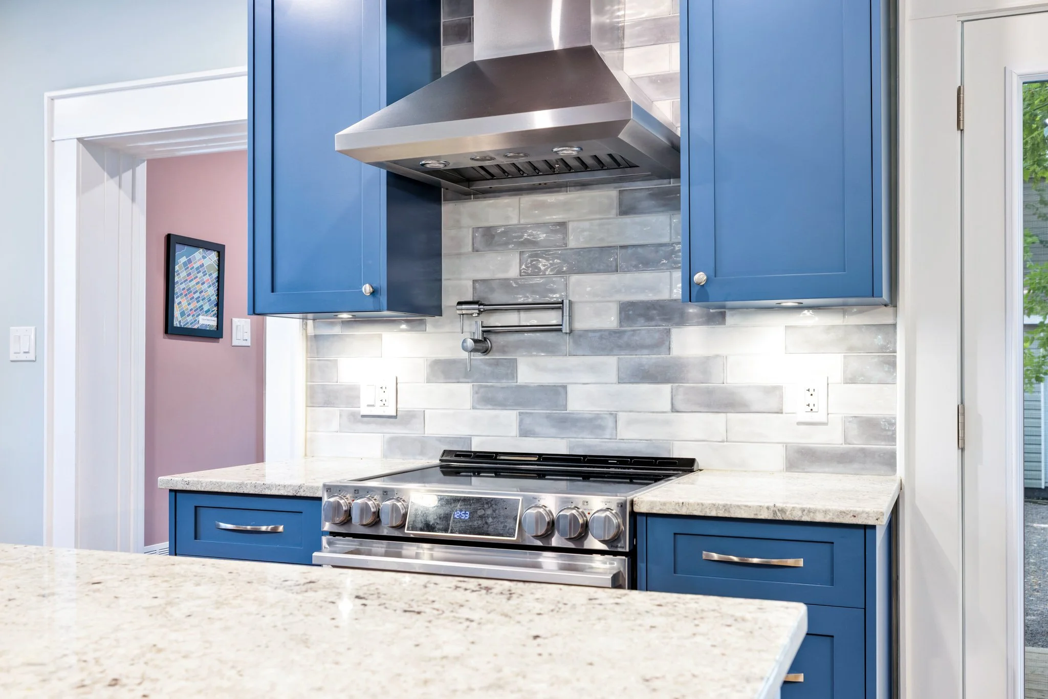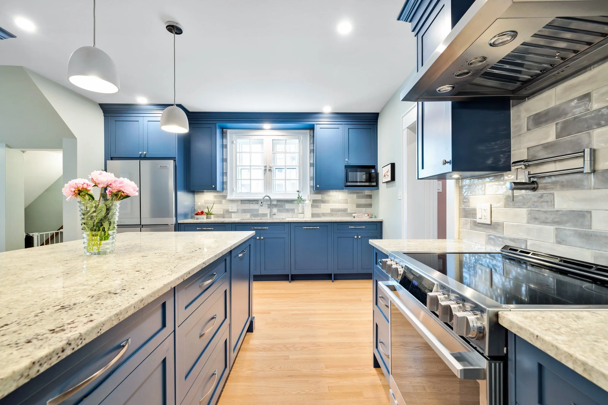 This custom-built kitchen makes a striking statement with bold dark blue cabinetry, balanced by crisp white stone countertops for a timeless contrast. The expansive island, both wide and deep, offers generous storage and comfortable seating, making it the true hub of the space. Cleverly integrated into the pantry cabinets is a handy coffee bar, keeping morning rituals organized and accessible. A pot filler above the stove adds modern convenience, while a beautifully finished hardwood beam cleverly conceals structural elements, bringing warmth and architectural interest. Ample square footage allows for a spacious dining area, and a large exterior door floods the room with natural light, creating an inviting and functional environment perfect for both cooking and gathering.