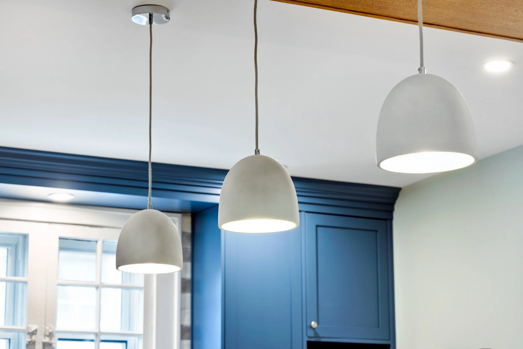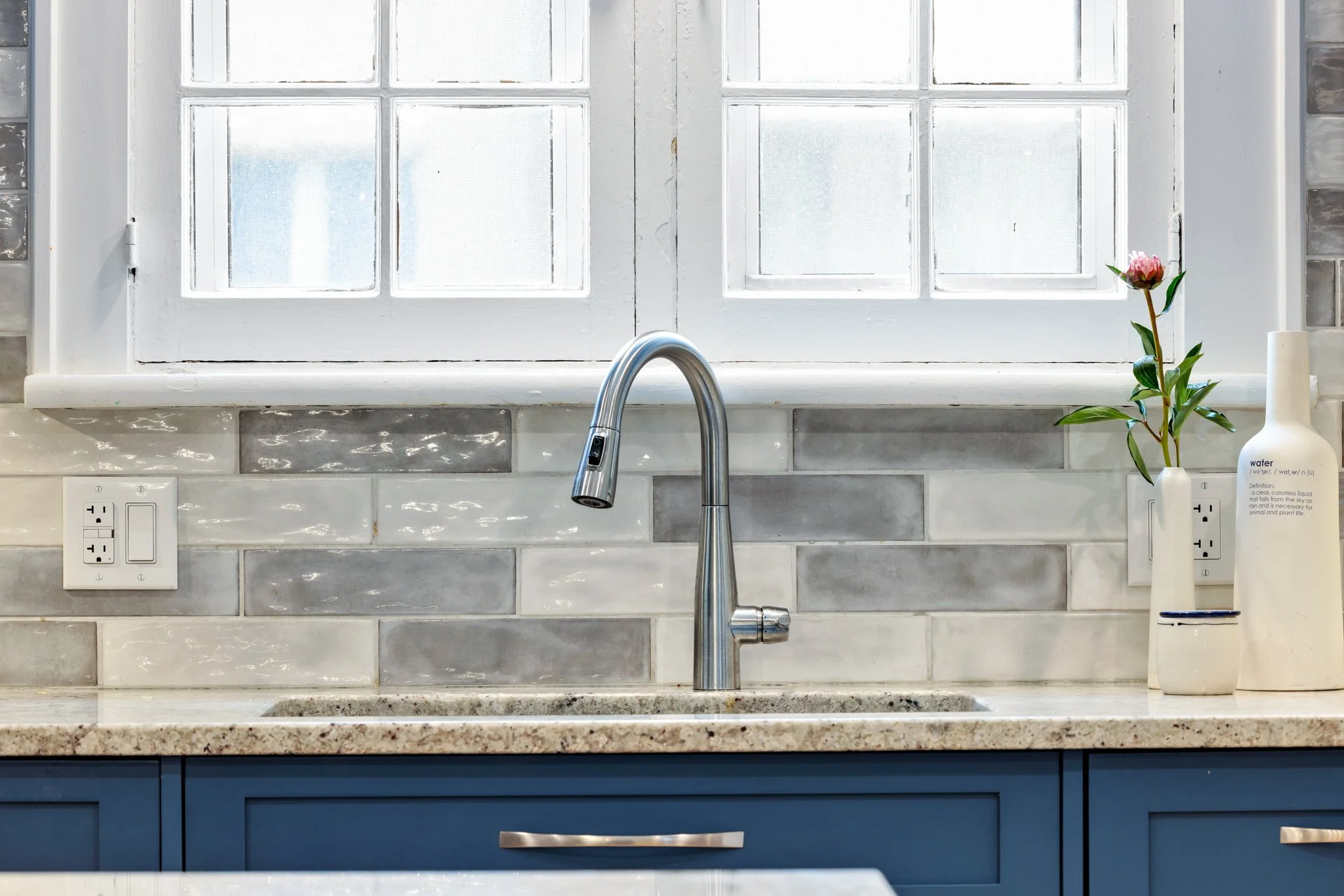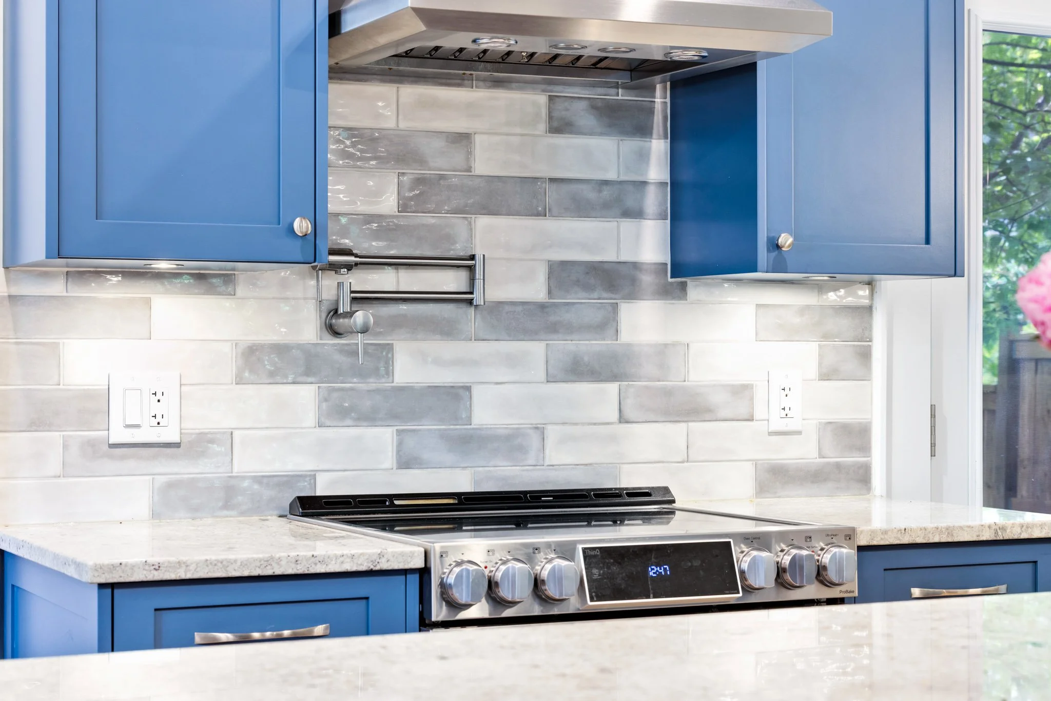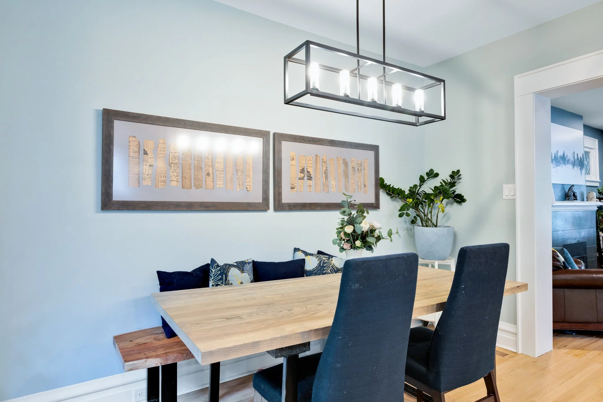 This custom-built kitchen makes a striking statement with bold dark blue cabinetry, balanced by crisp white stone countertops for a timeless contrast. The expansive island, both wide and deep, offers generous storage and comfortable seating, making it the true hub of the space. Cleverly integrated into the pantry cabinets is a handy coffee bar, keeping morning rituals organized and accessible. A pot filler above the stove adds modern convenience, while a beautifully finished hardwood beam cleverly conceals structural elements, bringing warmth and architectural interest. Ample square footage allows for a spacious dining area, and a large exterior door floods the room with natural light, creating an inviting and functional environment perfect for both cooking and gathering.